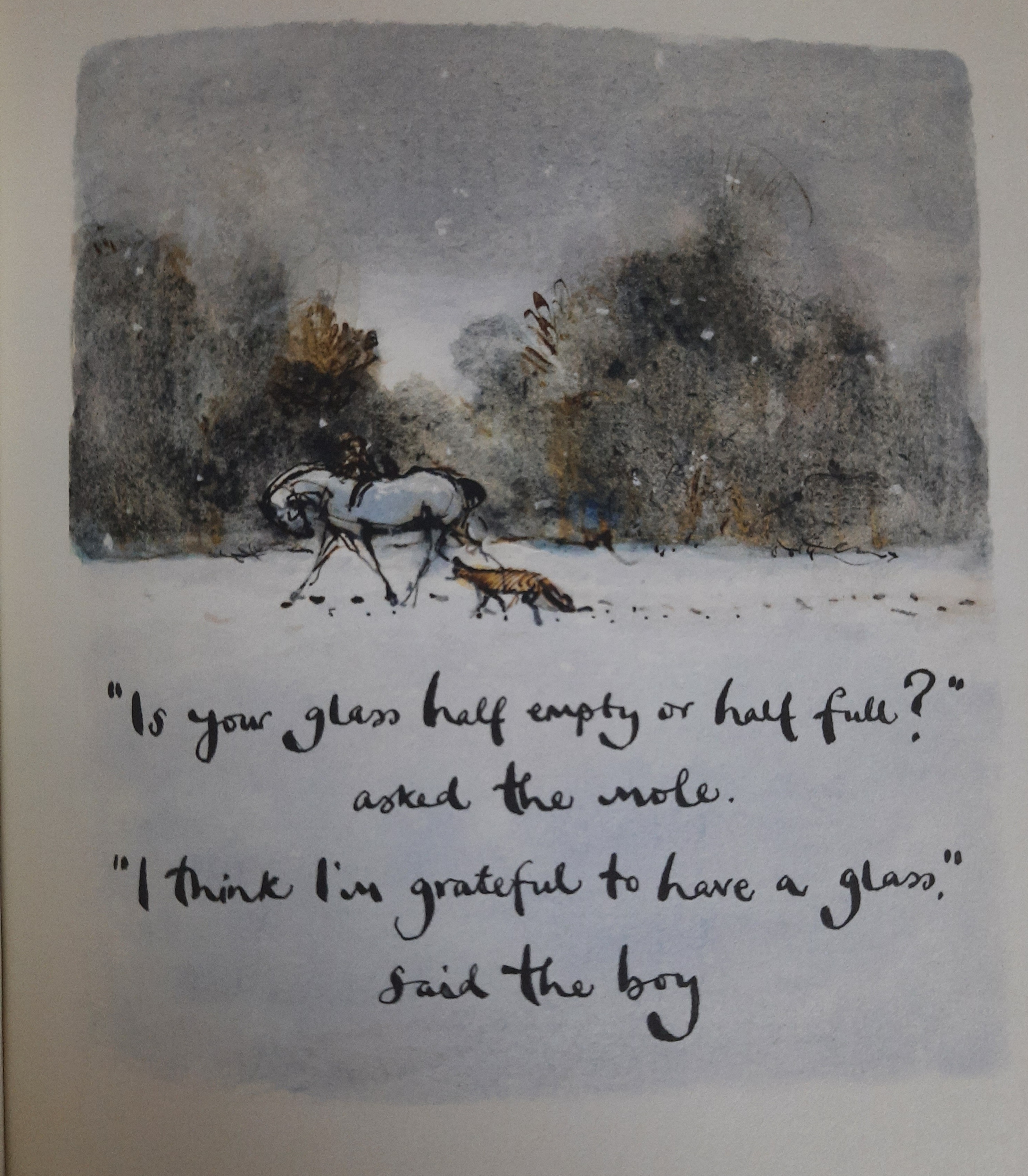 - The Boy, the Mole, the Fox and the Horse ⭐: This is a wonderful piece of art and a deeply philosophical book which will touch the heart of anyone irrespective of their age. I have photos of few pages of this book in my phone, so that I can read those during my difficult days. Remember that line about half/full glass at the beginning of this post, I learnt that from this book.