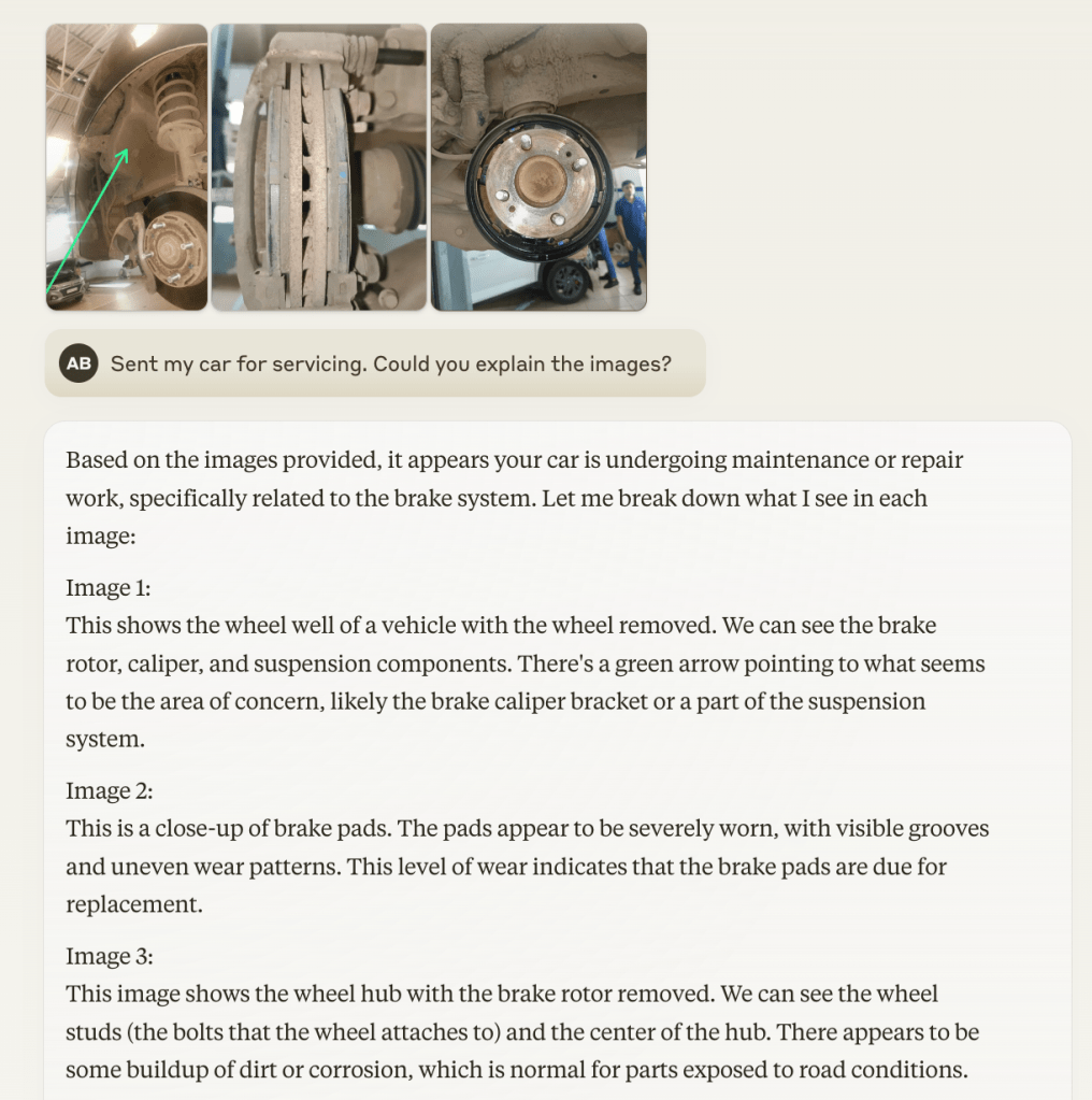 - Here is another interesting example. I sent my 12 year old car for servicing. The agency sent a bunch of photos of parts which are broken. I asked GPT to describe those parts and how those are related. For a person like me whose knowledge about car is limited to clutch, break and accelerator, that was a great help.